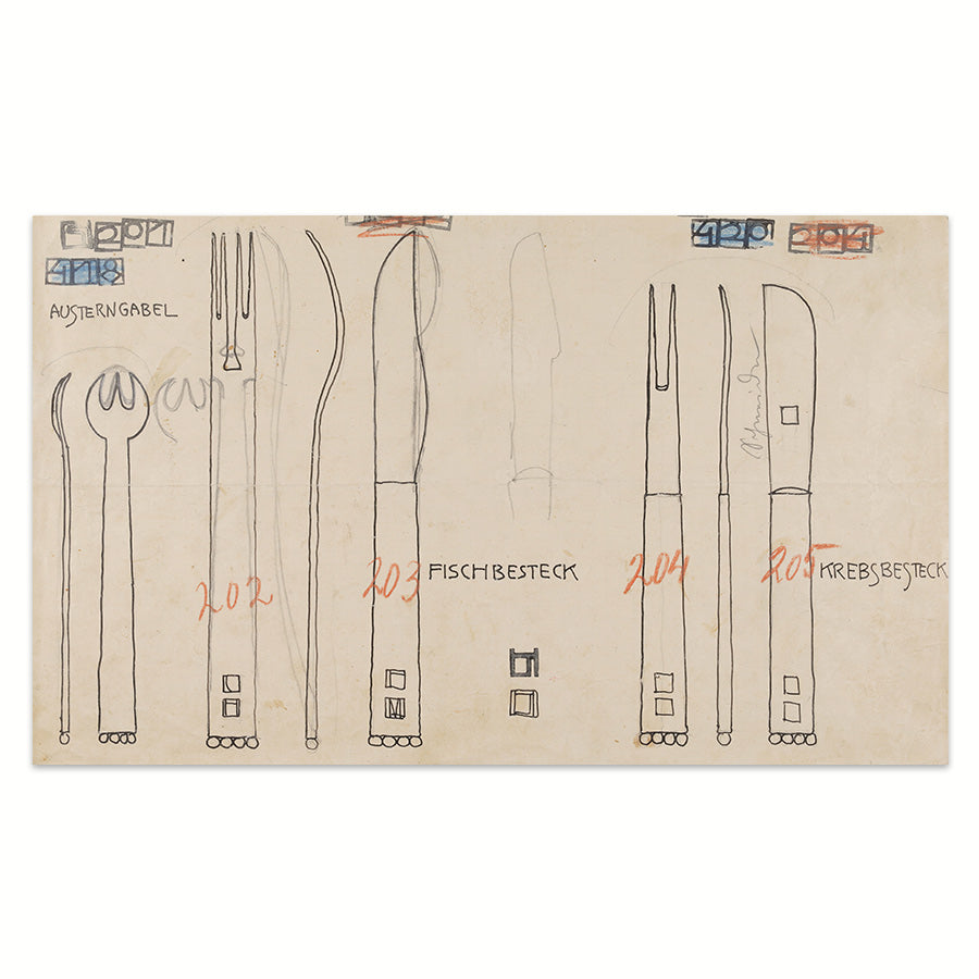 Design for cutlery for Lili and Fritz Waerndorfer. "Flat model": "Oyster fork", "Fish cutlery" fish fork, fish knife, "Crayfish cutlery" crayfish fork, crayfish knife.